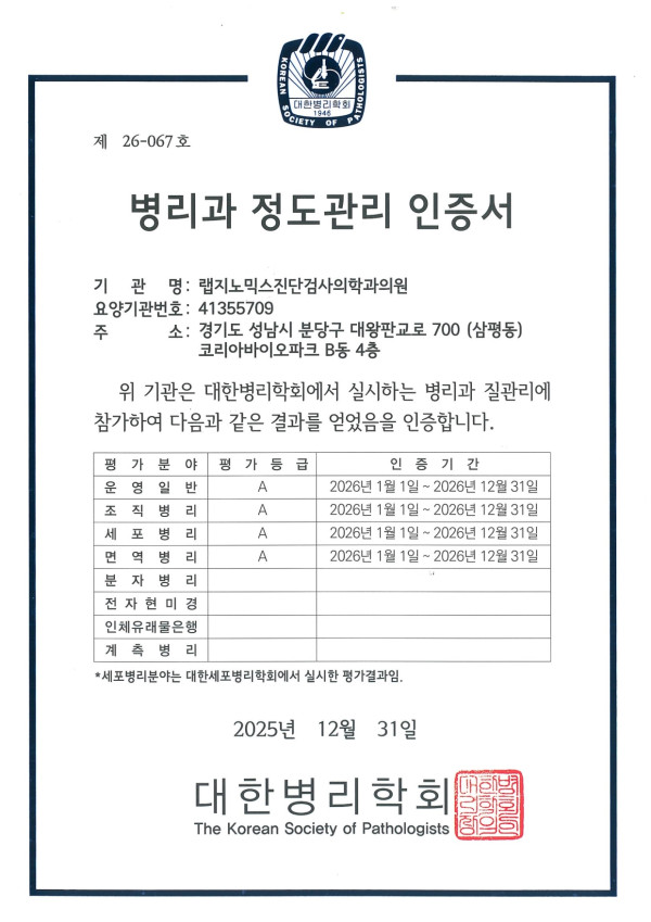 병리과 정도관리 인증서