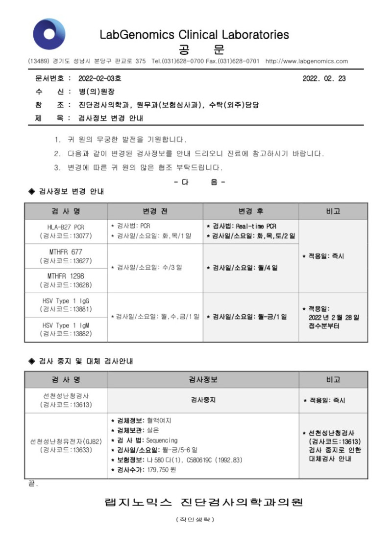 [공문] HLA-B27 PCR 외 5항목 검사정보변경안내