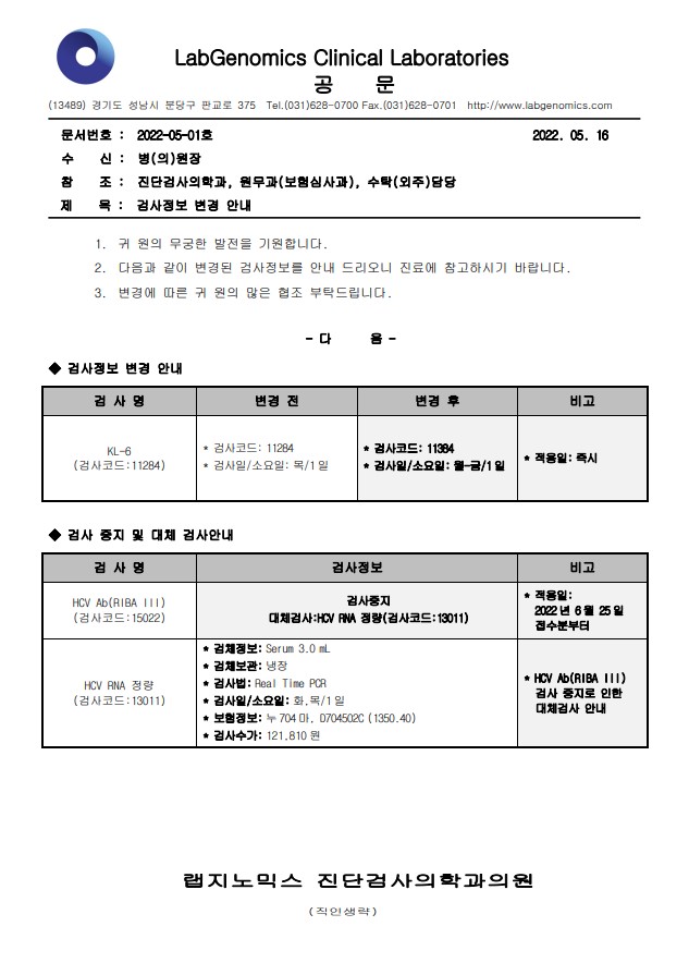 [공문] KL-6 외 1항목 검사정보변경안내 슈퍼관리자 2022-05-16 09:00:00 슈퍼관리자 0 1553 2022.05.16 09:00 2025.03.21 13:49 공문2022-05-01호 KL-6 외 1항목 검사정보변경안내.pdf (97.7K) 1. 귀 원의 무궁한 발전을 기원합니다. 검사정보 변경이 있어 다음과 같이 알려드리오니 업무에 참고하시기 바랍니다. 2. 주요내용: - KL-6 (검사코드:11284) : 검사코드/검사일/소요일 변경안내 * 적용일시: 즉시 - HCV Ab(RIBA lll) (검사코드:15022) : 검사 중지 및 대체 검사 안내 * 적용일시: 2022년 6월 25일 접수분부터 자세한 내용은 첨부파일을 참고하시기 바랍니다.