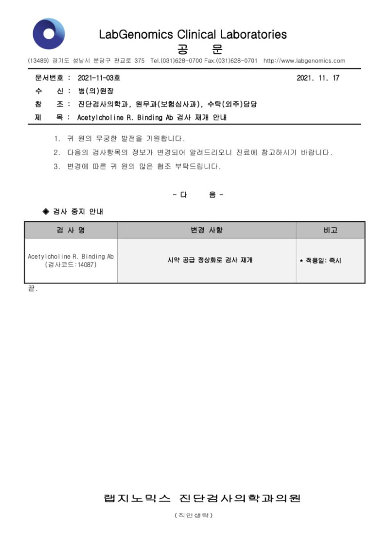 [공문] Acetylcholine R. Binding Ab 검사 재개 안내 슈퍼관리자 2021-11-17 09:00:00 슈퍼관리자 0 1476 2021.11.17 09:00 2025.03.21 13:37 공문2021-11-03호 Acetylcholine R. Binding Ab 검사 재개 안내.pdf (88.3K) 1. 귀 원의 무궁한 발전을 기원합니다. 검사정보 변경이 있어 다음과 같이 알려드리오니 업무에 참고하시기 바랍니다 2. 주요내용: - Acetylcholine R. Binding Ab (검사코드:14087) : 검사 재개 안내 * 적용일시: 즉시 자세한 내용은 첨부파일을 참고하시기 바랍니다.