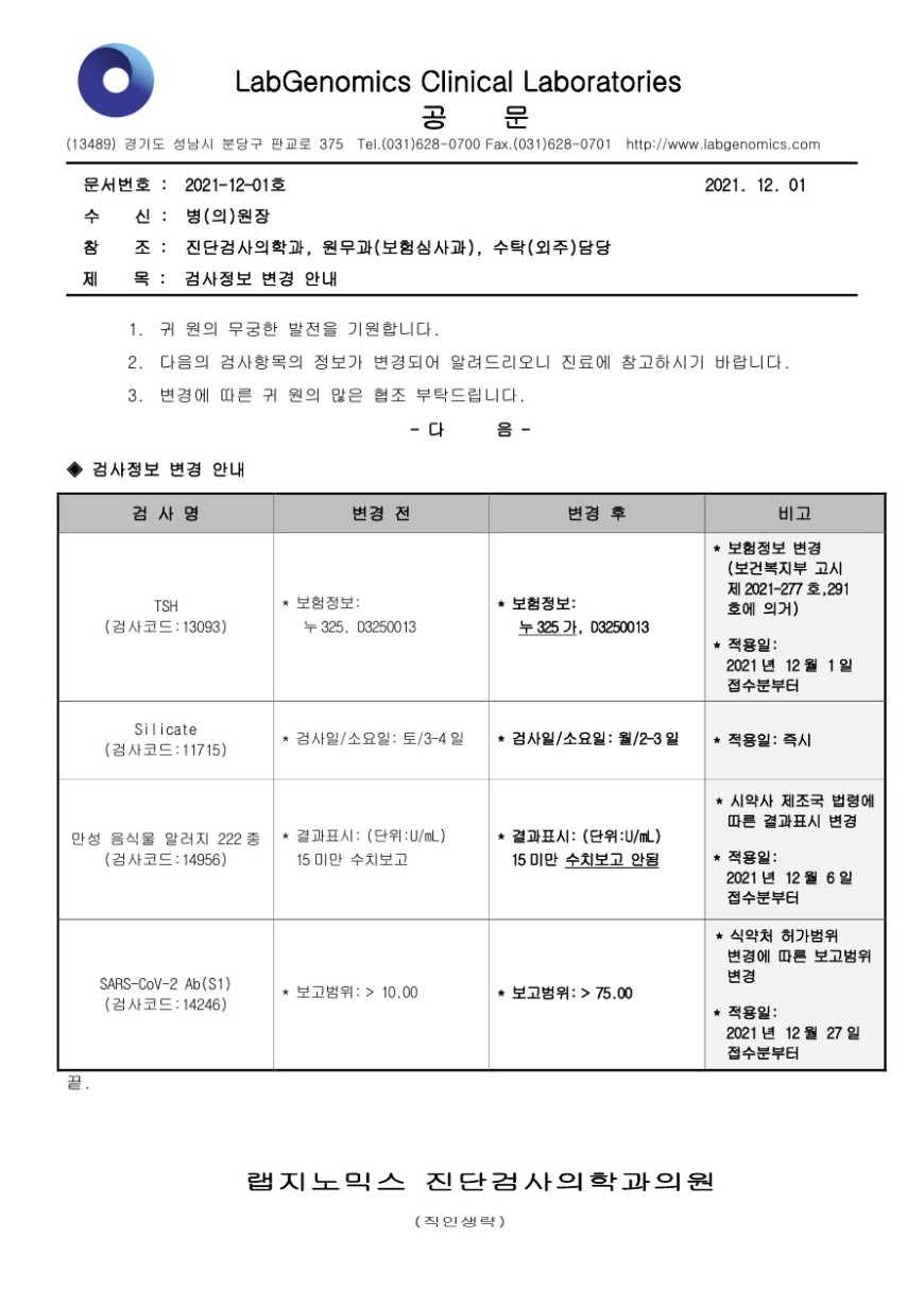 검사정보 변경이 있어 다음과 같이 알려드리오니 업무에 참고하시기 바랍니다.