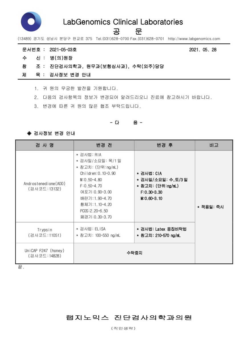 [공문] Androstenedione(ADD) 외 2항목 검사정보변경안내 슈퍼관리자 2021-05-28 09:00:00 슈퍼관리자 0 1535 2021.05.28 09:00 2025.03.21 13:22 공문2021-05-03호 AndrostenedioneADD 외 2항목 검사정보변경안내.pdf (96.9K) 1. 귀 원의 무궁한 발전을 기원합니다. 검사정보 변경이 있어 다음과 같이 알려드리오니 업무에 참고하시기 바랍니다. 2. 주요내용: - Androstenedione(ADD) (검사코드:13132) : 검사법/검사일/소요일 /참고치 변경안내 * 적용일시: 즉시 - Trypsin (검사코드:11051) : 검사법/참고치 변경안내 * 적용일시: 즉시 - UniCAP F247 (honey) (검사코드:14828) : 수탁 중지 안내 * 적용일시: 즉시