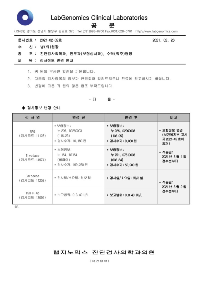 [공문] Tryptase 외 3항목 검사정보변경안내