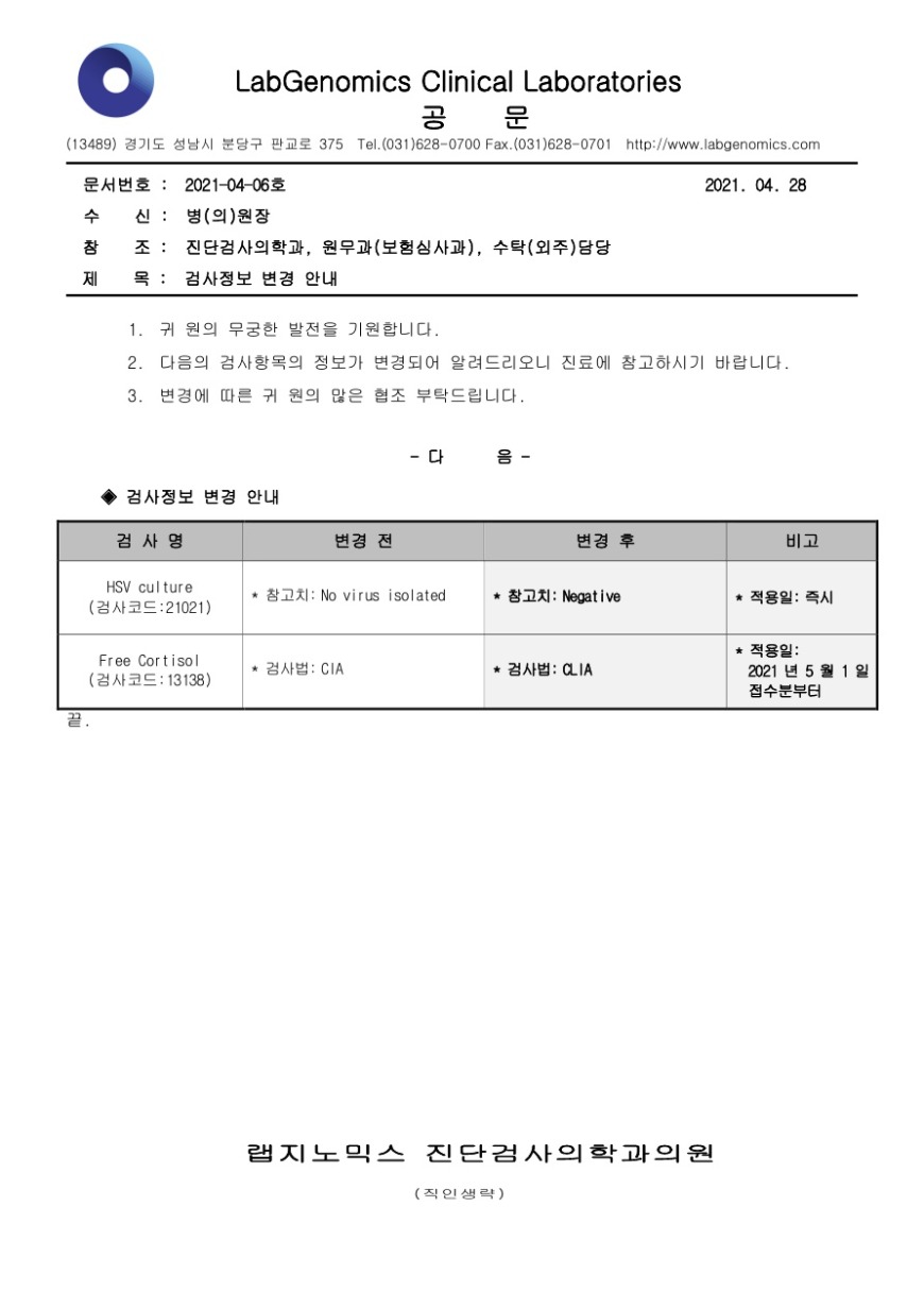 [공문] HSV culture 외 1항목 검사정보변경안내 슈퍼관리자 2021-04-28 09:00:00 슈퍼관리자 0 1435 2021.04.28 09:00 2025.03.21 13:10 공문2021-04-06호 HSV culture 외 1항목 검사정보변경안내.pdf (91.6K) 1. 귀 원의 무궁한 발전을 기원합니다. 검사정보 변경이 있어 다음과 같이 알려드리오니 업무에 참고하시기 바랍니다. 2. 주요내용: - HSV culture (검사코드:21021) : 참고치 변경안내 * 적용일시: 즉시 - Free Cortisol (검사코드:13138) : 검사법 변경안내 * 적용일시: 2021년 5월 1일 접수분부터