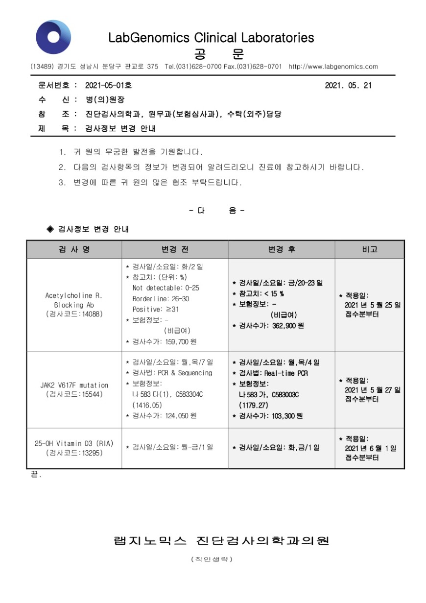[공문] Acetylcholine R. Blocking Ab 외 2항목 검사정보변경안내