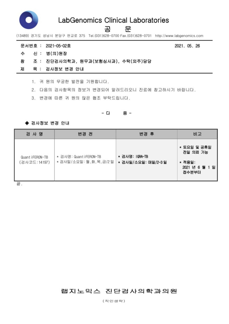 [공문] QuantiFERON-TB 검사정보변경안내 슈퍼관리자 2021-05-26 09:00:00 슈퍼관리자 0 1410 2021.05.26 09:00 2025.03.21 13:21 공문2021-05-02호 Quantiferon-TB 검사정보변경안내.pdf (92.4K) 1. 귀 원의 무궁한 발전을 기원합니다. 검사정보 변경이 있어 다음과 같이 알려드리오니 업무에 참고하시기 바랍니다. 2. 주요내용: - QuantiFERON-TB (검사코드:14197) : 검사명/검사일/소요일 변경안내 * 적용일시: 2021년 6월 1일 접수분부터