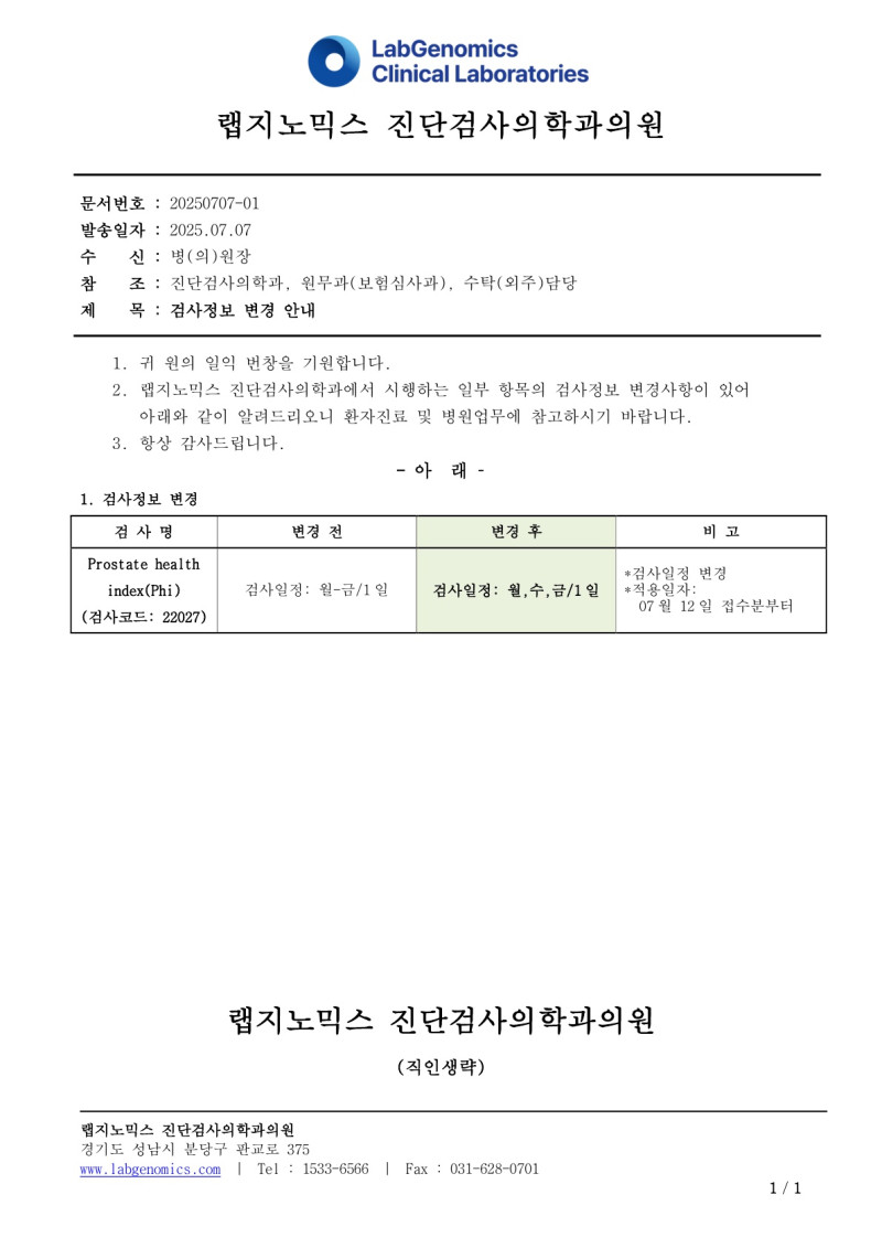 공문[20250707-01호]Phi 검사정보변경 안내 최고관리자 2025-07-07 18:33:34 최고관리자 0 710 2025.07.07 18:33 2025.07.07 18:33 공문[20250707-01호]Phi 검사정보변경 안내.pdf (129.1K) 공문[20250707-01호]Phi 검사정보변경 안내에 대하여 공유드리오니, 업무에 참고하시기 바랍니다. 1. 검사일정 변경 1.1 Prostate health index(Phi) / 22027 검사일정 변경
