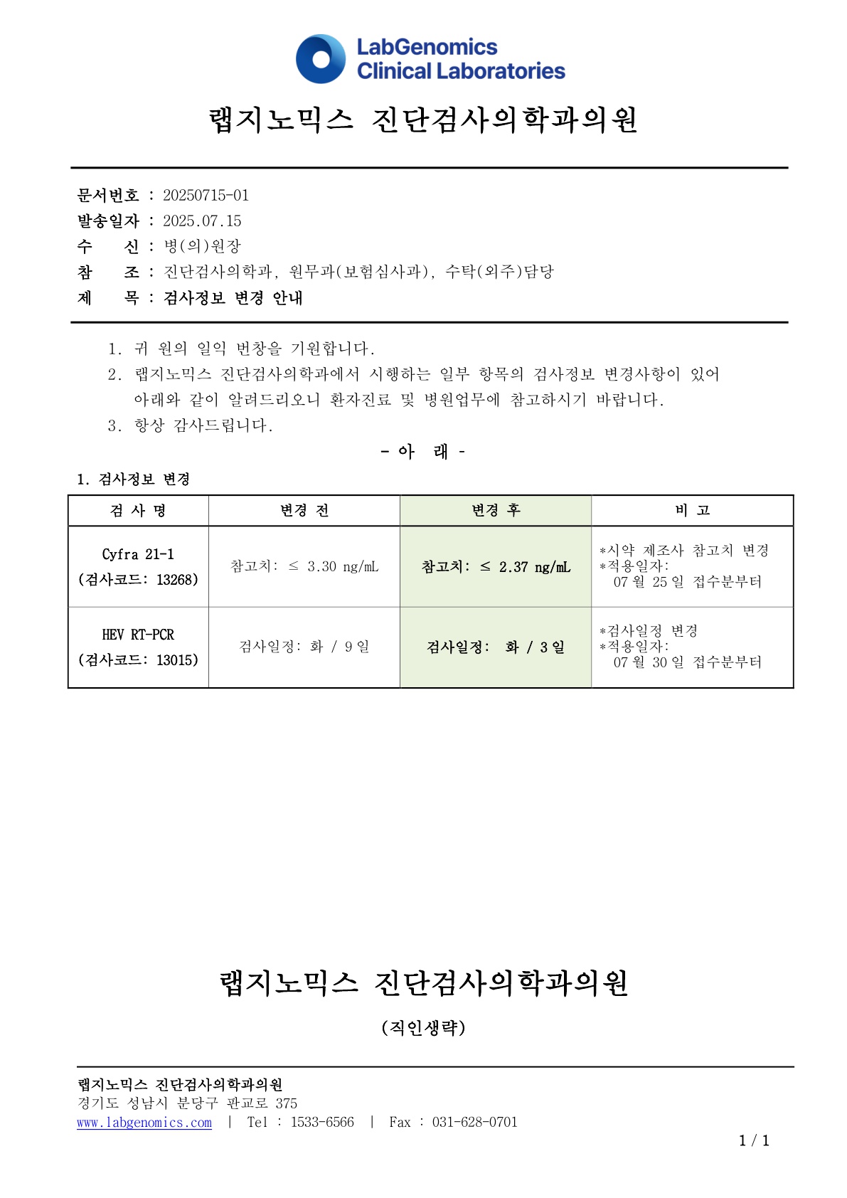 공문[20250715-01호]Cyfra 21-1외 1항목 검사정보변경 안내 최고관리자 2025-07-15 15:30:34 최고관리자 0 687 2025.07.15 15:30 2025.07.15 15:30 공문[20250715-01호]Cyfra 21-1외 1항목 검사정보변경 안내.pdf (134.2K) 공문[20250715-01호]Cyfra 21-1외 1항목 검사정보변경 안내에 대하여 공유드리오니, 업무에 참고하시기 바랍니다. 1. 검사정보 변경 1.1 Cyfra 21-1 (13268) 참고치 변경 1.2 HEV RT-PCR (13015) 검사일정 변경