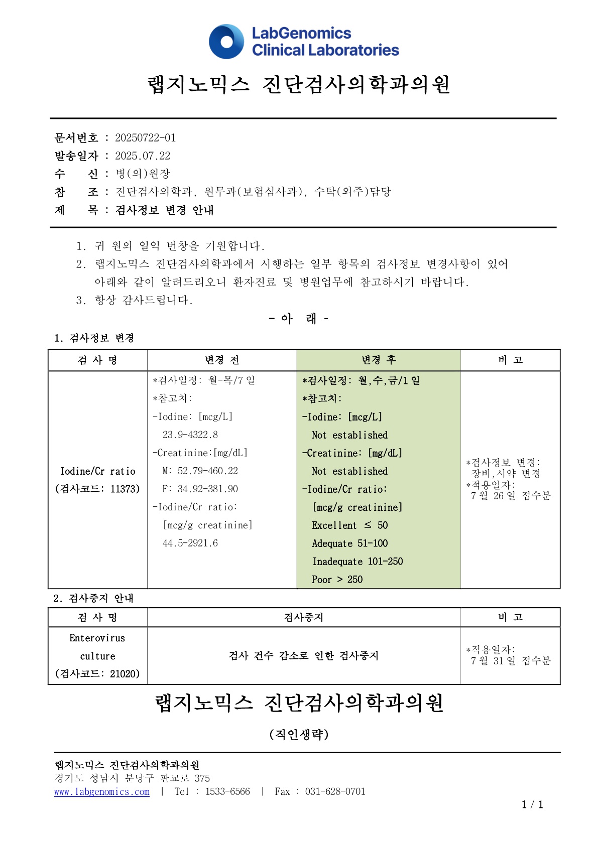 공문[20250722-01호]Iodine_Crea ratio외 1항목 검사정보변경 안내 최고관리자 2025-07-22 17:00:43 최고관리자 0 757 2025.07.22 17:00 2025.07.22 17:00 공문[20250722-01호]Iodine_Crea ratio외 1항목 검사정보변경 안내.pdf (141.1K) 공문[20250722-01호]Iodine_Crea ratio외 1항목 검사정보변경 안내에 대하여 공유드리오니, 업무에 참고하시기 바랍니다. 1. 검사정보 변경 1.1 Iodine/Cr ratio(11373) - 검사일정, 참고치 변경 1.2 검사중지 안내 - Enterovirus culture(21020)
