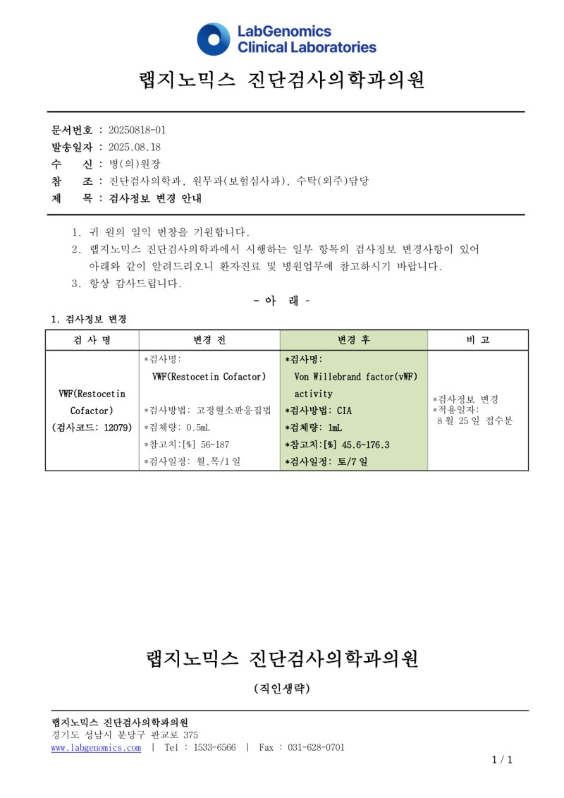 공문[20250818-01호]vWF(Ristocetin Cofactor) 검사정보변경 안내 최고관리자 2025-08-18 17:52:13 최고관리자 0 808 2025.08.18 17:52 2025.08.18 17:52 공문[20250818-01호]vWFRistocetin Cofactor 검사정보변경 안내.pdf (137.6K) 공문[20250818-01호 ]vWF(Ristocetin Cofactor) 검사정보변경 안내에 대하여 공유드리오니, 업무에 참고하시기 바랍니다. 1. 검사정보 변경 1.1 vWF(Ristocetin Cofactor) / 12079 - 검사명, 검사방법, 검체량, 참고치, 검사일정 변경