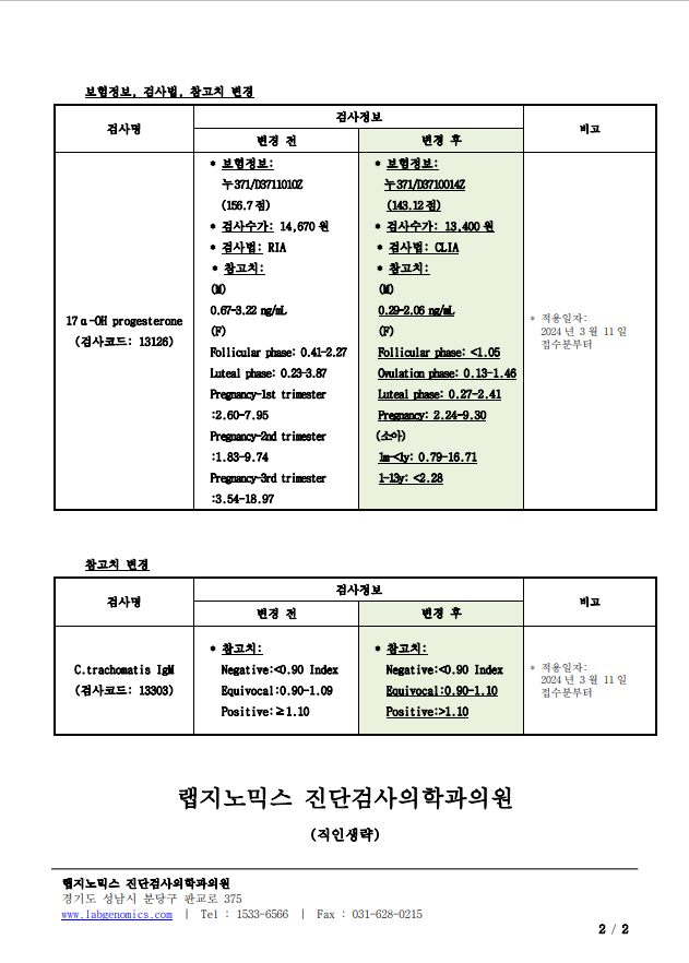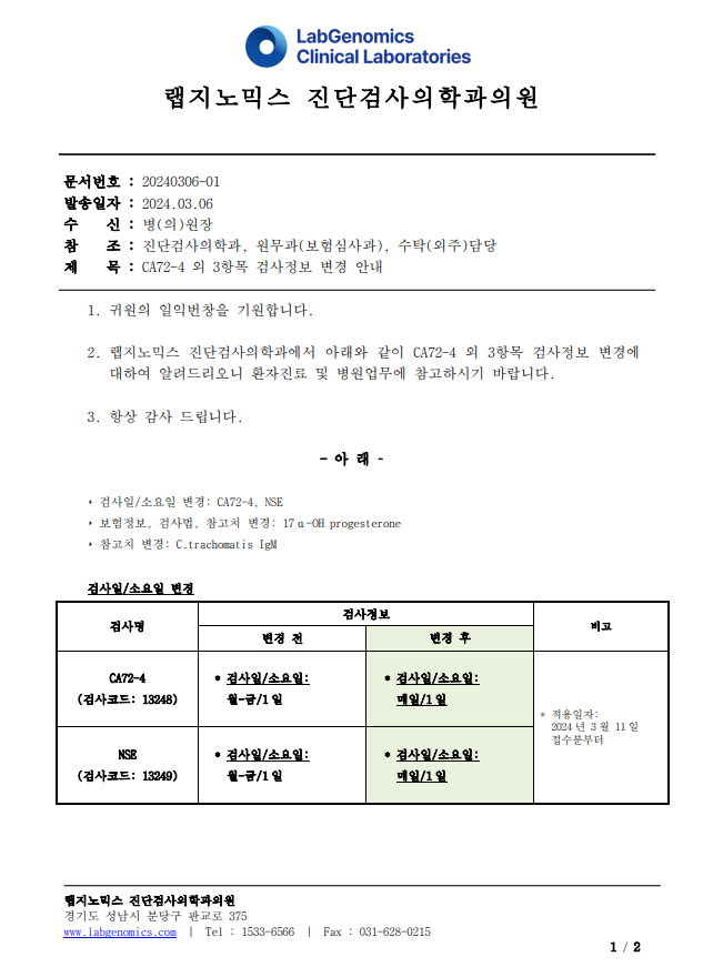 공문[20240306-01호] CA72-4 외 3항목 검사정보 변경 안내 슈퍼관리자 2024-03-06 09:00:00 슈퍼관리자 0 1404 2024.03.06 09:00 2025.03.21 15:27 공문[20240306-01호] CA72-4 외 3항목 검사정보 변경 안내.pdf (137.7K) CA72-4 외 3항목 검사정보 변경에 대하여 다음과 같이 공유 드리오니, 확인 후 업무에 적용해 주시기 바랍니다. ∘주요내용 ‣ 검사일/소요일 변경: CA72-4, NSE ‣ 보험정보, 검사법, 참고치 변경: 17α-OH progesterone ‣ 참고치 변경: C.trachomatis IgM