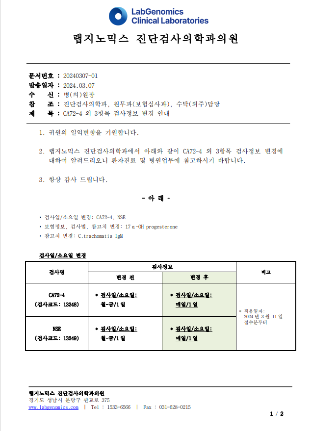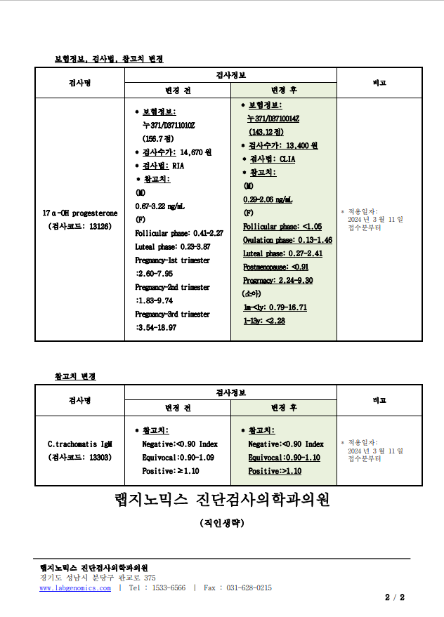 추가공문[20240307-01호] CA72-4 외 3항목 검사정보 변경 안내 슈퍼관리자 2024-03-07 09:00:00 슈퍼관리자 0 1384 2024.03.07 09:00 2025.03.21 15:29 추가공문[20240307-01호] CA72-4 외 3항목 검사정보 변경 안내.pdf (137.8K) 3월 6일 게시한 공문[20240306-01호]에 추가사항이 발생하여 다음과 같이 공유 드리오니, 확인 후 업무에 적용해 주시기 바랍니다. ∘주요내용 ‣ 보험정보, 검사법, 참고치 변경: 17α-OH progesterone (추가내용) 17α-OH progesterone(검사코드: 13126) 참고치: "Postmenopause: <0.91"