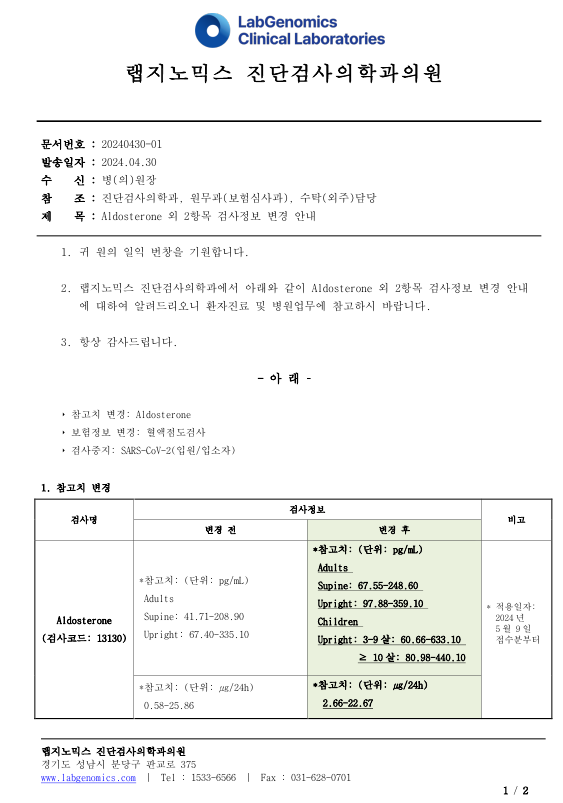 공문[20240430-01호] Aldosterone 외 2항목 검사정보 변경 안내