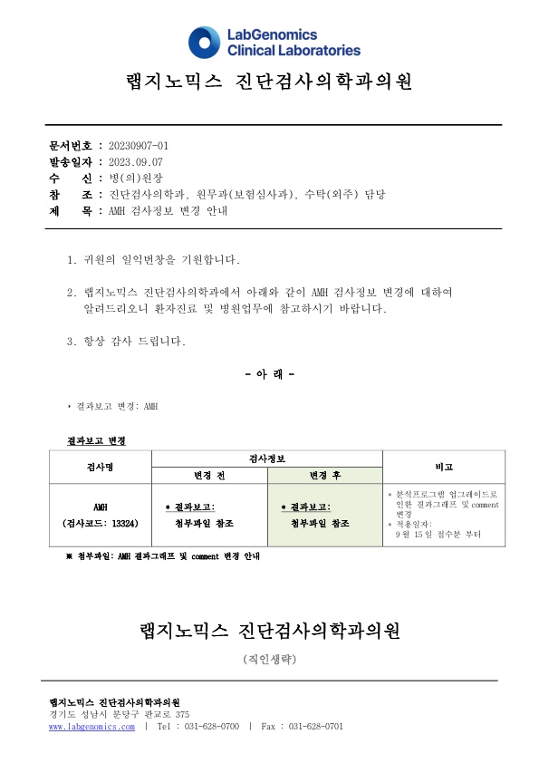 공문[20230907-01호] AMH 검사정보 변경 안내 슈퍼관리자 2023-09-07 09:00:00 슈퍼관리자 0 1511 2023.09.07 09:00 2025.03.21 15:10 공문[20230907-01호] AMH 검사정보 변경 안내.zip (219.9K) AMH 검사정보 변경에 대하여 다음과 같이 공유 드리오니, 확인 후 업무에 적용해 주시기 바랍니다. ∘주요내용 ‣ 결과보고 변경: AMH