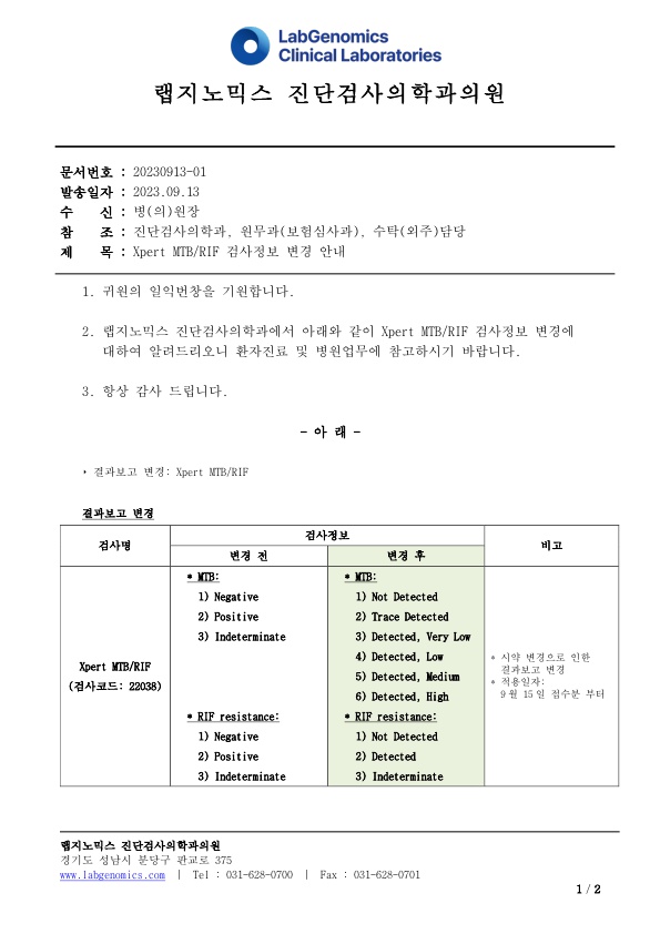 공문[20230913-01호] Xpert MTB/RIB 검사정보 변경 안내 슈퍼관리자 2023-09-13 09:00:00 슈퍼관리자 0 1521 2023.09.13 09:00 2025.03.21 15:11 공문[20230913-01호] Xpert MTB RIB 검사정보 변경 안내.pdf (119.8K) Xpert MTB/RIB 검사정보 변경에 대하여 다음과 같이 공유 드리오니, 확인 후 업무에 적용해 주시기 바랍니다. ∘주요내용 ‣ 결과보고 변경: Xpert MTB/RIB