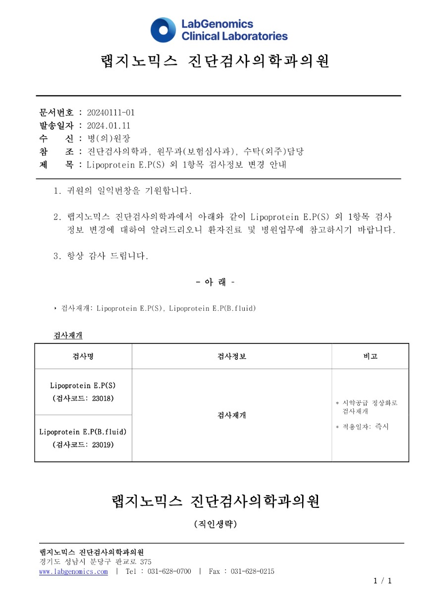 공문[20240111-01호] Lipoprotein E.P(S) 외 1항목 검사정보 변경 안내 슈퍼관리자 2024-01-11 09:00:00 슈퍼관리자 0 1399 2024.01.11 09:00 2025.03.21 15:20 공문[20240111-01호] Lipoprotein E.PS 외 1항목 검사정보 변경 안내.pdf (112.4K) Lipoprotein E.P(S) 외 1항목 검사정보 변경에 대하여 다음과 같이 공유 드리오니, 확인 후 업무에 적용해 주시기 바랍니다. ∘주요내용 ‣ 검사재개: Lipoprotein E.P(S), Lipoprotein E.P(B.fluid)