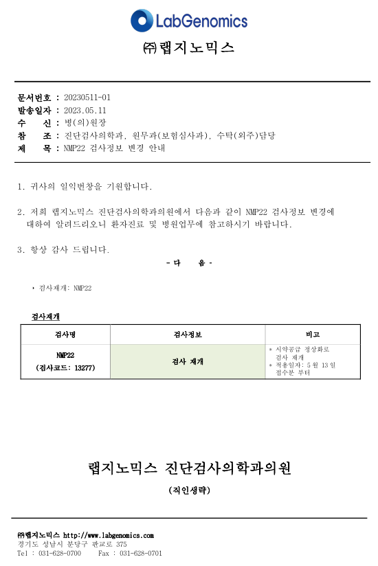 공문[20230511-01호] NMP22 검사정보 변경 슈퍼관리자 2023-05-11 09:00:00 슈퍼관리자 0 1381 2023.05.11 09:00 2025.03.21 14:51 공문[20230511-01호] NMP22 검사정보 변경.pdf (105.3K) NMP22 검사정보 변경에 대하여 다음과 같이 공유 드리오니, 확인 후 업무에 적용해 주시기 바랍니다. ∘주요내용 ‣검사재개: NMP22