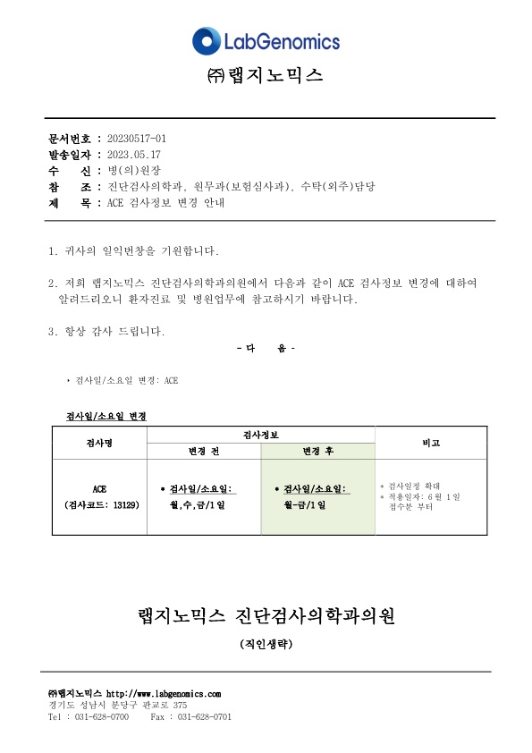 공문[20230517-01호] ACE 검사정보 변경 안내 슈퍼관리자 2023-05-17 09:00:00 슈퍼관리자 0 1359 2023.05.17 09:00 2025.03.21 14:52 공문[20230517-01호] ACE 검사정보 변경 안내.pdf (106.7K) ACE 검사정보 변경에 대하여 다음과 같이 공유 드리오니, 확인 후 업무에 적용해 주시기 바랍니다. ∘주요내용 ‣검사일/소요일 변경: ACE