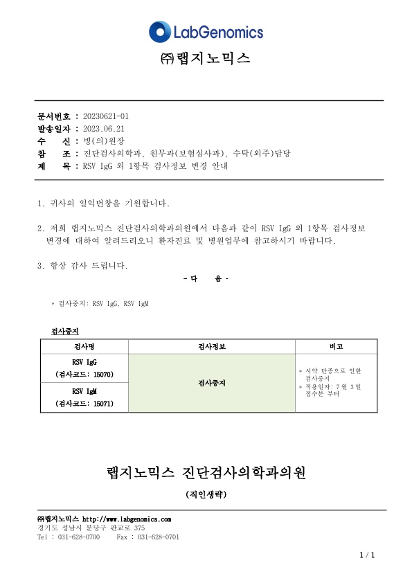 공문[20230621-01호] RSV IgG 외 1항목 검사정보 변경 안내 슈퍼관리자 2023-06-21 09:00:00 슈퍼관리자 0 1364 2023.06.21 09:00 2025.03.21 14:56 공문[20230621-01호] RSV IgG 외 1항목 검사정보 변경 안내.pdf (106.8K) RSV IgG 외 1항목 검사정보 변경에 대하여 다음과 같이 공유 드리오니, 확인 후 업무에 적용해 주시기 바랍니다. ∘주요내용 ‣ 검사중지: RSV IgG, RSV IgM