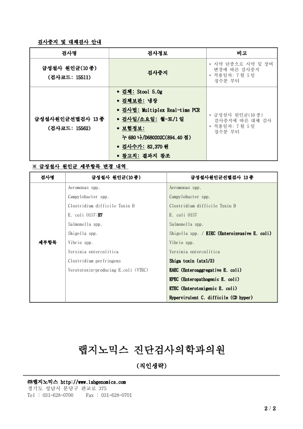 ‣ 검사중지 및 대체 검사 안내: 급성설사 원인균(10종)