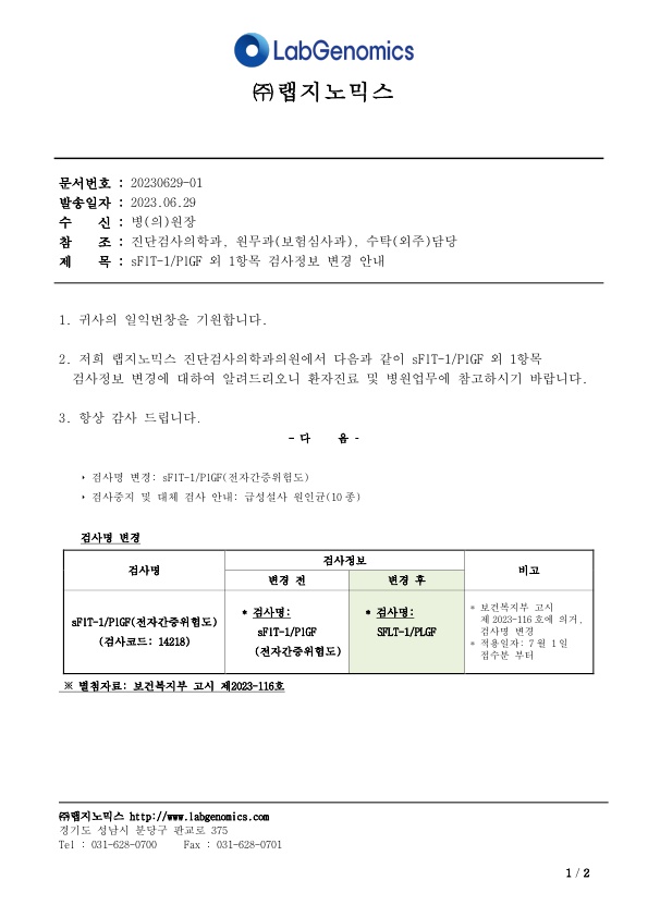 공문[20230629-01호] sFlT-1/PlGF 외 1항목 검사정보 변경 안내