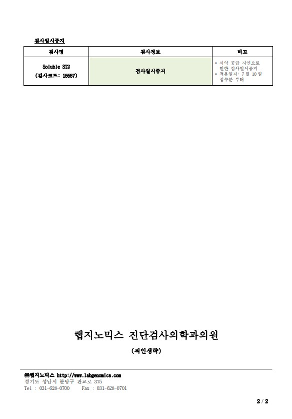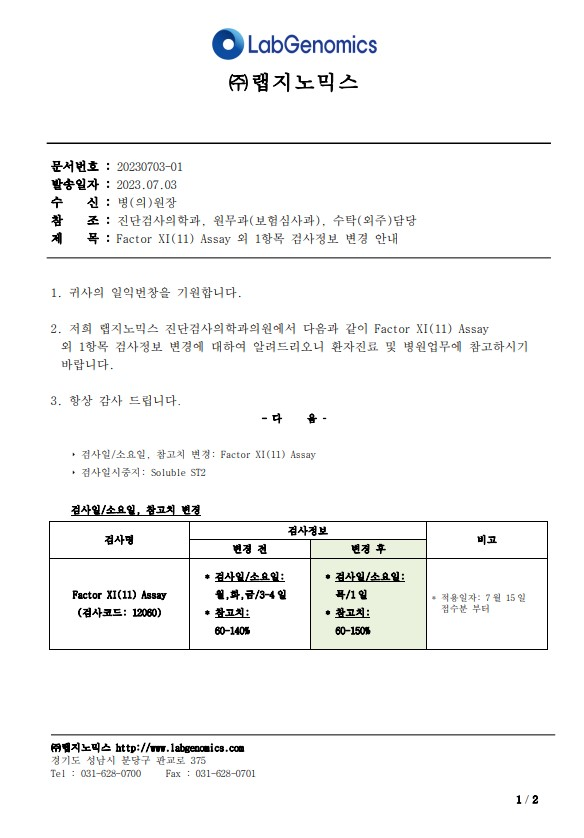 공문[20230703-01호] Factor XI(11) Assay 외 1항목 검사정보 변경 안내