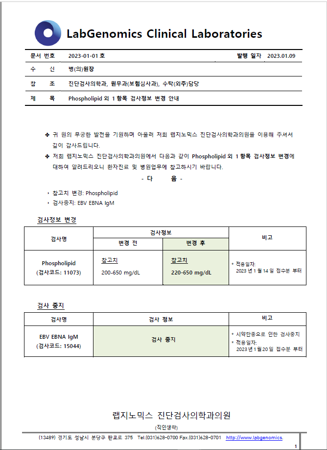 공문 [2023-01-01호] Phospholipid외 1항목 검사정보 변경 안내 슈퍼관리자 2023-01-09 09:00:00 슈퍼관리자 0 1411 2023.01.09 09:00 2025.03.21 18:05 공문 [2023-01-01호] Phospholipid외 항목 검사정보 변경 안내.pdf (178.2K) Phospholipid외 1항목 검사정보 변경에 대하여 다음과 같이 공유 드리오니, 확인 후 업무에 적용해 주시기 바랍니다. ○ 주요내용 ▶ 참고치 변경: Phospholipid ▶ 검사중지: EBV EBNA IgM