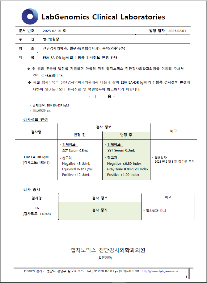 공문 [2023-02-01호] EBV EA DR IgM 외 1 항목 검사정보 변경 안내 슈퍼관리자 2023-02-01 09:00:00 슈퍼관리자 0 1467 2023.02.01 09:00 2025.03.21 14:20 공문 [2023-02-01ȣ] EBV EA-DR IgM외 1항목 검사정보 변경 안내.pdf (183.7K) EBV EA-DR IgM 외 1항목 검사정보 변경에 대하여 다음과 같이 공유 드리오니, 확인 후 업무에 적용해 주시기 바랍니다. ∘주요내용 ‣ 검체정보: EBV EA-DR IgM ‣ 검사중지: C6