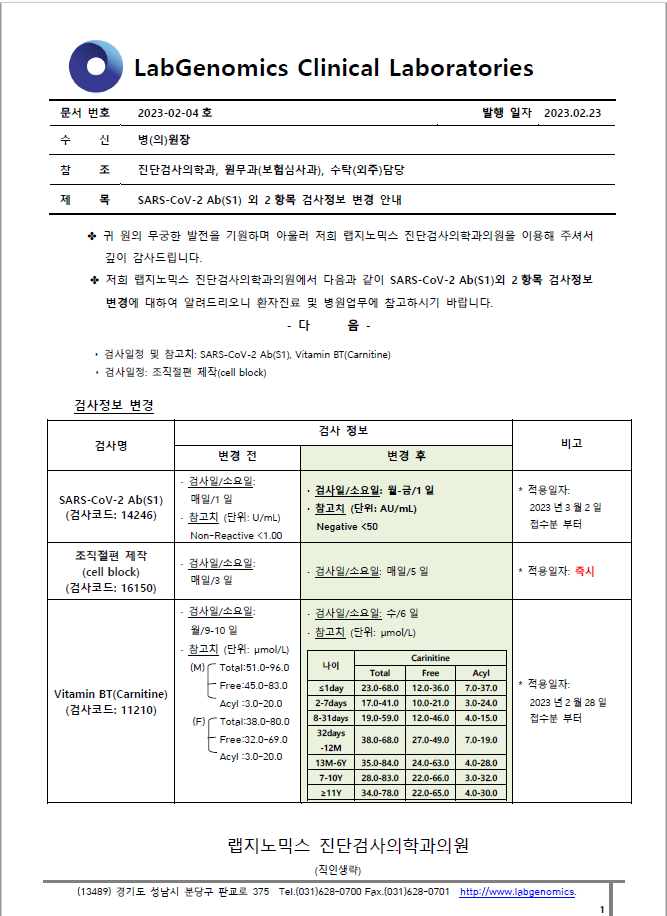 공문 [2023-02-04호] SARS-CoV-2 Ab(S1) 외 2항목 검사정보 변경 안내 슈퍼관리자 2023-02-23 09:00:00 슈퍼관리자 0 1492 2023.02.23 09:00 2025.03.21 14:42 공문 [2023-02-04ȣ] SARS-CoV-2 AbS1 외 2항목 검사정보 변경 안내.pdf (239.4K) SARS-CoV-2 Ab(S1) 외 2항목 검사정보 변경에 대하여 다음과 같이 공유 드리오니, 확인 후 업무에 적용해 주시기 바랍니다. ∘주요내용 ‣ 검사일정 및 참고치: SARS-CoV-2 Ab(S1), Vitamin BT(Carnitine) ‣ 검사일정: 조직절편 제작(cell block)