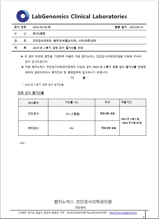 공문 [2023-03-02호] 2023년 2분기 검체 검사 질가산율 안내 슈퍼관리자 2023-03-15 09:00:00 슈퍼관리자 0 1402 2023.03.15 09:00 2025.03.21 14:44 공문 [2023-03-02ȣ] 2023년 2분기 검체 검사 질가산율 안내.pdf (176.5K) "2023년 2분기 검체 검사 질가산율" 에 대하여 다음과 같이 공유 드리오니, 확인 후 업무에 적용해 주시기 바랍니다. ∘주요내용 ‣ 2023년 2분기 검체 검사 질가산율