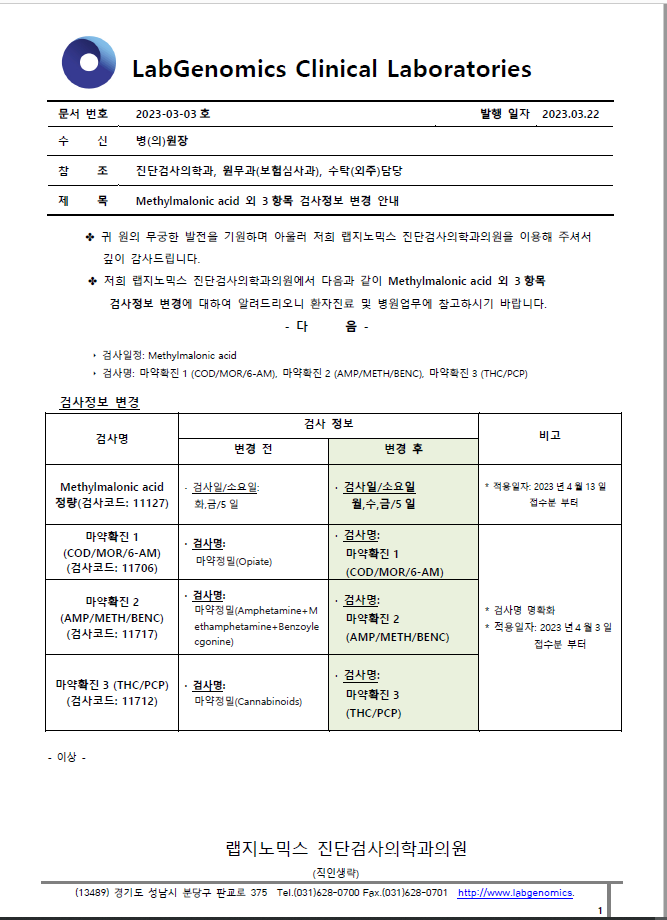 공문 [2023-03-03호] Methylmalonic acid 외 3항목 검사정보 변경 안내 슈퍼관리자 2023-03-22 09:00:00 슈퍼관리자 0 1417 2023.03.22 09:00 2025.03.21 14:45 공문 [2023-03-03ȣ] Methylmalonic acid 외3항목 검사정보 변경 안내.pdf (231.2K) Methylmalonic acid 외 3항목 검사정보 변경에 대하여 다음과 같이 공유 드리오니, 확인 후 업무에 적용해 주시기 바랍니다. ∘주요내용 ‣ 검사일정: Methylmalonic acid ‣ 검사명: 마약확진1 (COD/MOR/6-AM), 마약확진2 (AMP/METH/BENC), 마약확진3 (THC/PCP)
