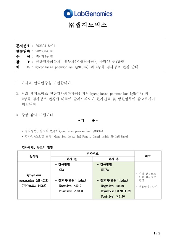 Mycoplasma pneumoniae IgM(CIA) 외 2항목 검사정보 변경에 대하여 다음과 같이 공유 드리오니, 확인 후 업무에 적용해 주시기 바랍니다.