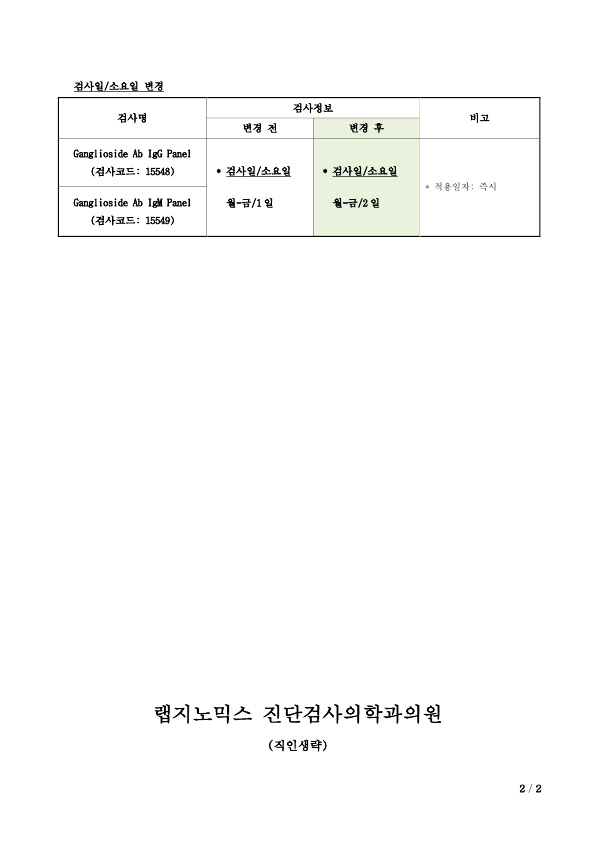 ‣ 검사일/소요일 변경: Ganglioside Ab IgG Panel, Ganglioside Ab IgM Panel
