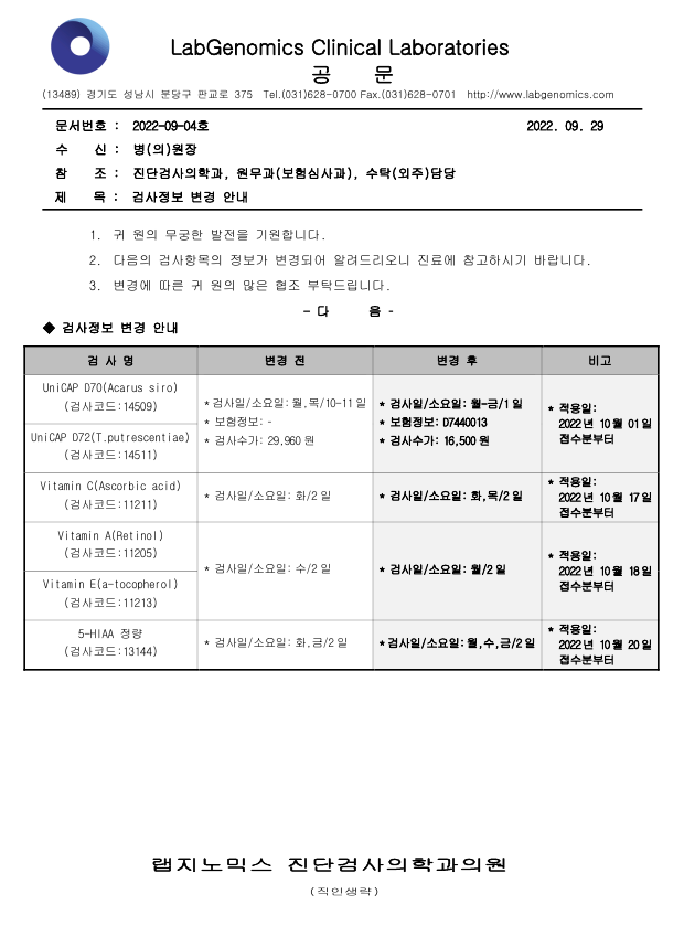 [공문] UniCAP D70(Acarus siro)외 5항목 검사정보 변경안내
