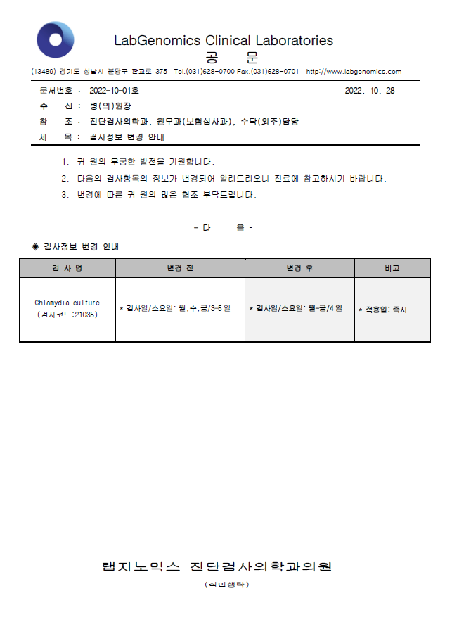 [공문] Chlamydia culture 검사정보 변경안내 슈퍼관리자 2022-10-28 09:00:00 슈퍼관리자 0 1379 2022.10.28 09:00 2025.03.21 14:02 공문2022-10-01호 검사정보 변경안내.pdf (87.8K) 1. 귀 원의 무궁한 발전을 기원합니다. 검사정보 변경이 있어 다음과 같이 알려드리오니 업무에 참고하시기 바랍니다. 2. 주요내용: - Chlamydia culture(검사코드:21035) : 검사일/소요일 변경안내 * 적용일시: 즉시