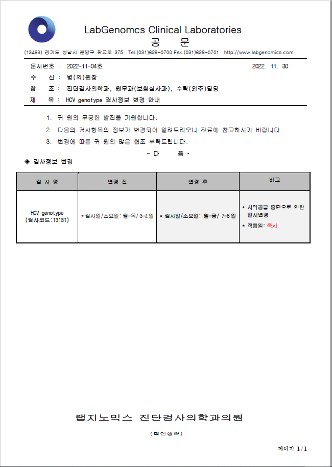 [공문] HCV genotype 검사정보 변경 안내 슈퍼관리자 2022-11-30 09:00:00 슈퍼관리자 0 1504 2022.11.30 09:00 2025.03.21 14:06 공문2022-11-04호 HCV genotype 검사정보 변경 안내.pdf (92.3K) 1. 귀 원의 무궁한 발전을 기원합니다. 검사정보 변경에 대하여 다음과 같이 알려드리오니 업무에 참고하시기 바랍니다. 2. 주요내용: - HCV genotype(검사코드:13131) : 검사일정변경안내 * 적용일시: 즉시