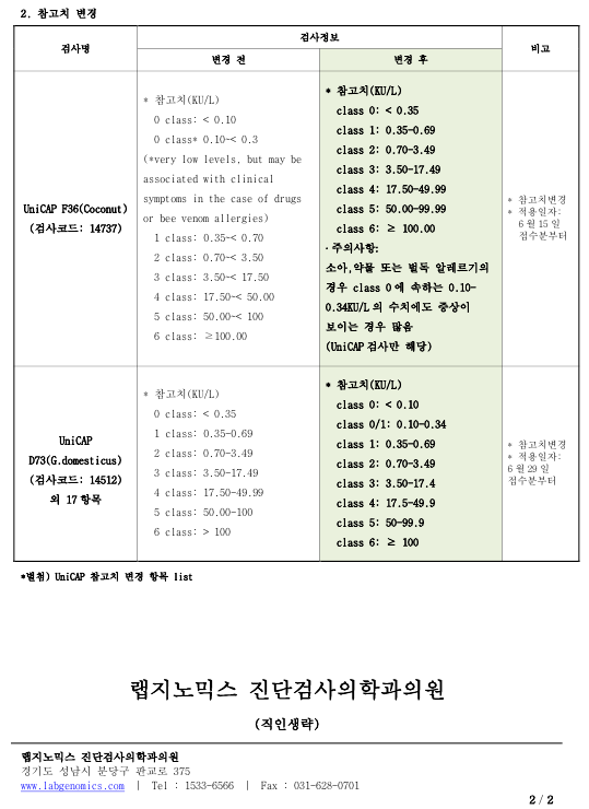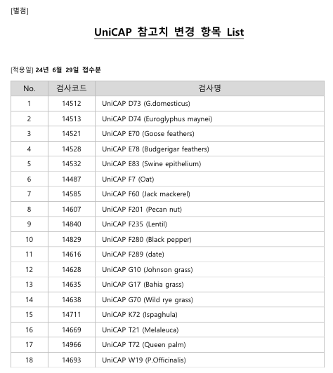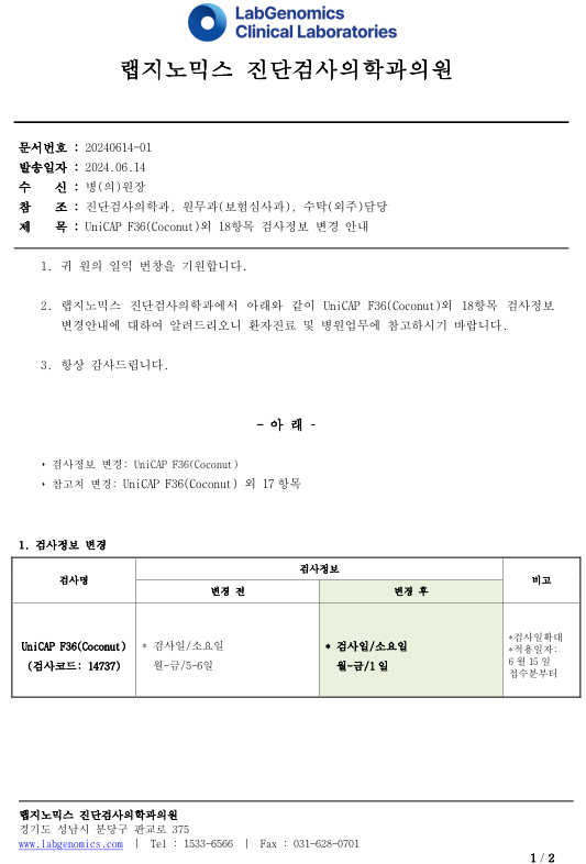 공문[20240614-01호] UniCAP F36(Coconut) 외 18항목 검사정보 변경 안내