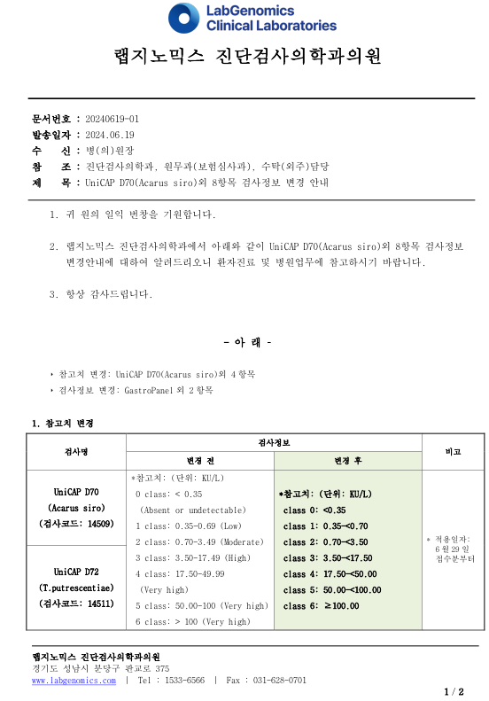(수정) 공문[20240619-01호] UniCAP D70(Acarus siro)외 8항목 검사정보 변경 안내