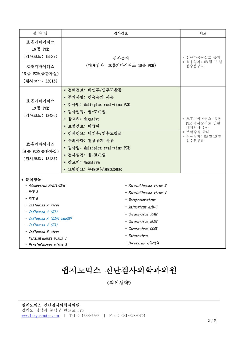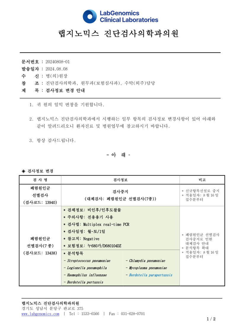 공문[20240808-01호]폐렴원인균선별검사외 2항목 검사정보변경 안내 최고관리자 2024-10-11 14:17:15 최고관리자 0 1360 2024.10.11 14:17 2024.10.11 14:17 공문[20240808-01호]폐렴원인균선별검사외 2항목 검사정보변경 안내.pdf (164.5K) 공문[20240808-01호]폐렴원인균선별검사외 2항목 검사정보변경에 대하여 다음과 같이 공유 드리오니, 확인 후 업무에 적용해 주시기 바랍니다.