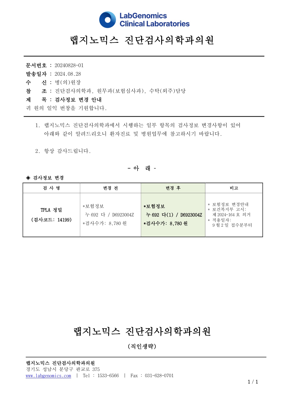 공문[20240828-01호]TPLA정밀 검사정보변경 안내 최고관리자 2024-10-11 14:23:29 최고관리자 0 1366 2024.10.11 14:23 2024.10.11 14:23 공문[20240828-01호]TPLA정밀 검사정보변경 안내.pdf (126.6K) 공문[20240828-01호]TPLA정밀 검사정보변경에 대하여 다음과 같이 공유 드리오나, 확인 후 업무에 적용해 주시기 바랍니다.