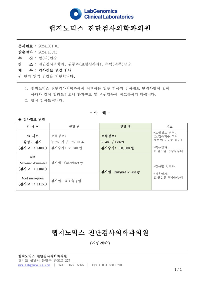 공문[20241031-01호]NK세포활성도 검사외 2항목 검사정보변경 안내 최고관리자 2025-01-08 21:59:51 최고관리자 0 1255 01.08 21:59 2025.01.08 21:59 공문[20241031-01호]NK세포활성도검사외2항목검사정보변경안내.pdf (133.9K) 공문[20241031-01호]NK세포활성도 검사외 2항목 검사정보변경 안내에 대하여 공유드리오니 업무에 참고하시기 바랍니다.