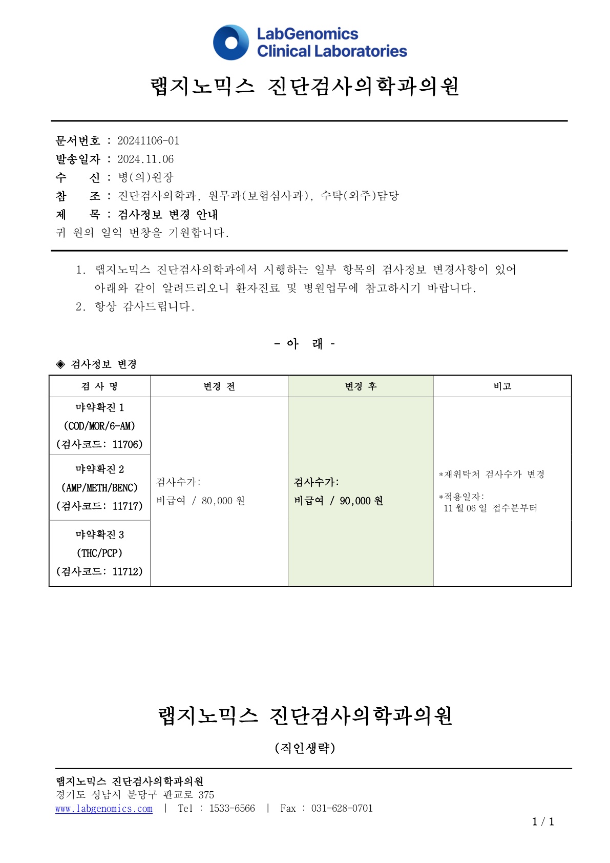 공문[20241106-01호]마약확진검사 3항목 검사정보변경 안내 최고관리자 2025-01-08 22:00:49 최고관리자 0 1365 01.08 22:00 2025.01.08 22:00 공문[20241106-01호]마약확진검사3항목검사정보변경안내.pdf (129.8K) 공문[20241106-01호]마약확진검사 3항목 검사정보변경 안내에 대하여 공유드리오니 업무에 참고하시기 바랍니다.
