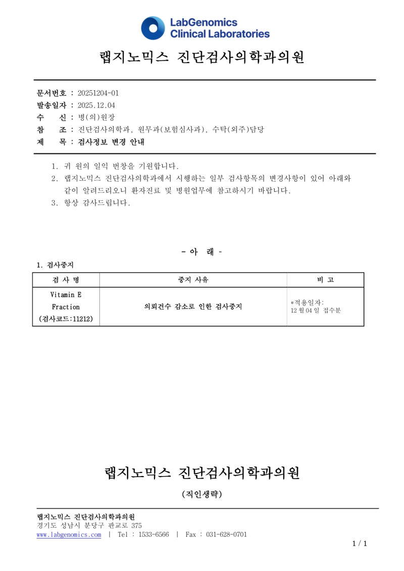 공문[20251204-01호] Vitamin E Fraction 검사중지안내 최고관리자 2025-12-04 12:37:18 최고관리자 0 113 12.04 12:37 2025.12.04 12:38 공문[20251204-01호] Vitamin E Fraction 검사중지안내.pdf (326.5K) Vitamin E Fraction 검사중지 안내에 대하여 다음과 같이 공유 드리오니, 확인 후 업무에 적용해 주시기 바랍니다. ∘주요 내용 ‣ 검사중지 안내 : Vitamin E Fraction