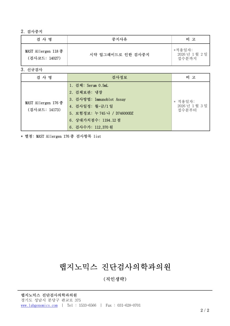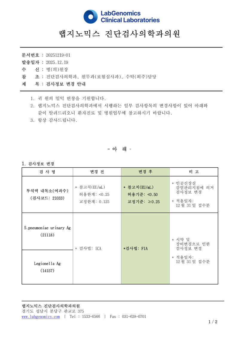 공문[20251219-01호]투석액 내독소(여과수) 4항목 검사정보변경안내 최고관리자 2025-12-19 14:34:24 최고관리자 0 81 12.19 14:34 2025.12.19 14:41 공문[20251219-01호]투석액 내독소여과수 외 4항목 검사정보변경안내.pdf (175.8K) 공문[20251219-01호]투석액 내독소(여과수) 4항목 검사정보변경안내에 대하여 다음과 같이 공유 드리오니, 확인 후 업무에 적용해 주시기 바랍니다. ∘주요내용 ‣ 참고치 변경 : 투석액 내독소(여과수) ‣ 검사법 변경 : S.pneumoniae urinary Ag / Legionella Ag ‣ 검사중지 : MAST Allergen 118종 ‣ 신규검사 : MAST Allergen 176종