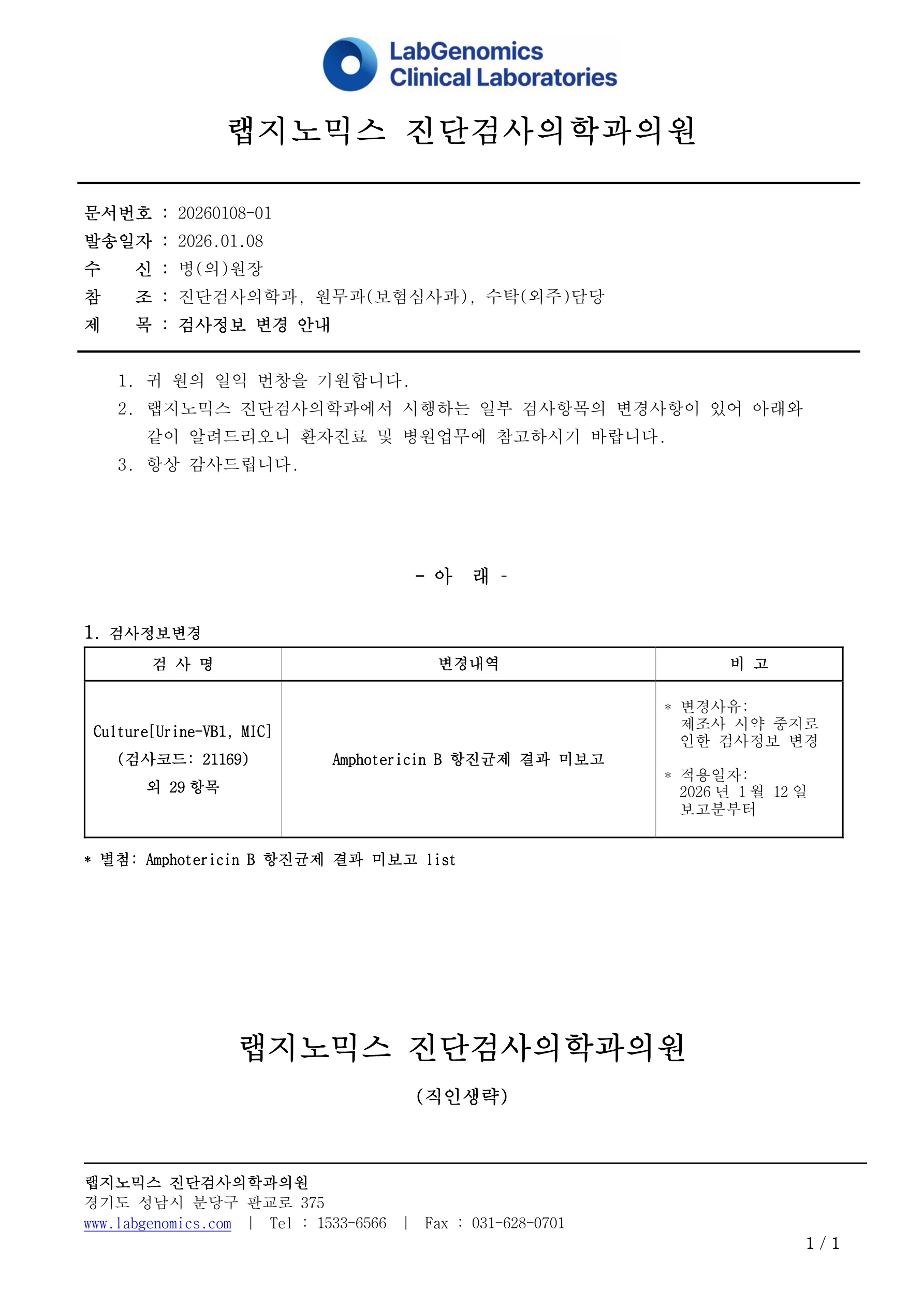 공문[20260108-01호]Culture[Urine-VB1, MIC] 외 29항목 검사정보변경안내 최고관리자 2026-01-08 14:36:14 최고관리자 0 134 01.08 14:36 2026.01.08 14:36 공문[20260108-01호]Culture[Urine-VB1, MIC] 외 29항목 검사정보변경안내.pdf (80.4K) 2026.01.08 14:36 별첨 Amphotericin B 항진균제 결과 미보고 list.pdf (42.1K) 공문[20260108-01호]Culture[Urine-VB1, MIC] 외 29항목 검사정보변경안내에 대하여 다음과 같이 공유 드리오니, 확인 후 업무에 적용해 주시기 바랍니다.